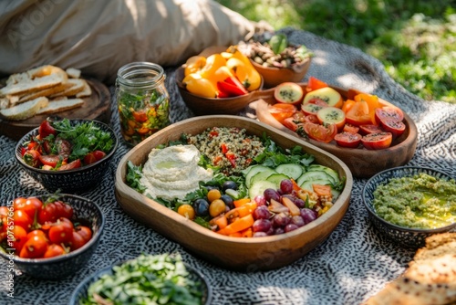 A vibrant picnic spread featuring fresh salads and colorful fruits. Perfect for a sunny day outdoors. Enjoy healthy eating with friends and family. Generative AI