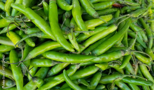 A vibrant pile of fresh green chili peppers with stems, densely packed and ideal for culinary, agricultural, or market-themed visuals.