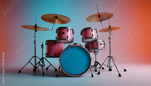 vibrant, colourful, music, musical instrument, studio shot, bright, bold, modern, contemporary, artistic, performance, percussion, kit, drum, two-tone, striking, high-coloured, energetic, creative, dynamic, rhythmic, instrument, beat, drumming, concert, practice, studio, musician, pink, red, teal, sound, audio, composition, expressive, artistry, photo