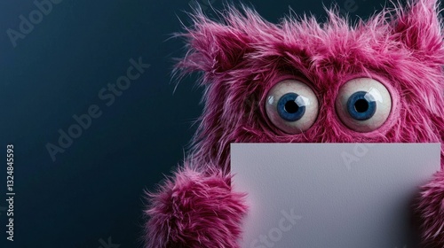A vibrant pink monster with fluffy fur and big round eyes is holding a blank white sheet of paper. The dark blue background contrasts with the creature, adding visual interest
