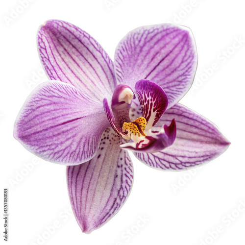 A vibrant purple orchid with intricate veining and a striking structure, showcasing its delicate petals and central markings.