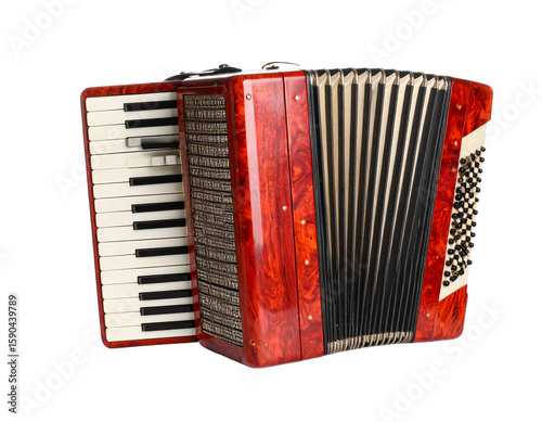 A vibrant red accordion with white keys, an isolated musical instrument on a white background.