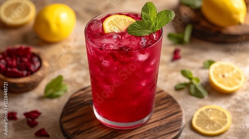 A vibrant red hibiscus drink with lemon and mint, perfect for summer refreshment. Ideal for food blogs, drink menus, and healthy lifestyle concepts.