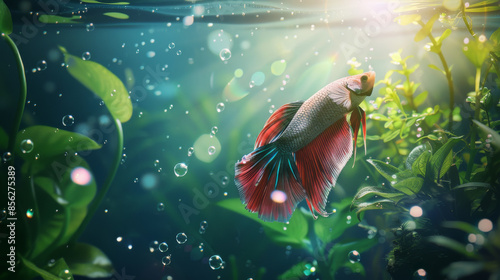 A vibrant, red-finned betta fish gracefully glides through a lush underwater world, illuminated by shimmering sunlight and surrounded by bubbles and green plants.