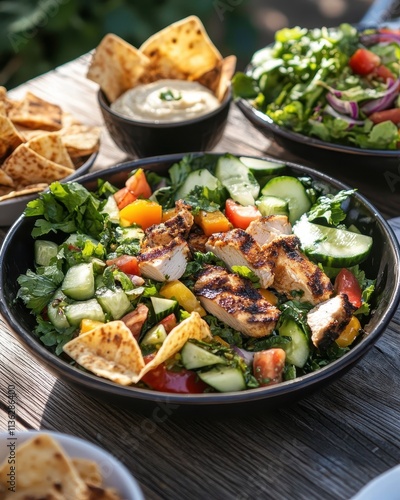 salad, chicken, vegetable, cucumber, tomatoes, cilantro, tortilla, chips, healthy, meal, dining, fresh, colourful, bowl, cookery, herb, greener, pepper, garlic, dip, hummus, nourishment, lunch, snack, cooking, ingredient, platter, garnish, presentation, rustic, table, favor, receipe, delicious, appetising, serving, diet, balance, wholesome, feast, gathering, sharing, enjoyment, taste, culinary, freshness, variety, texture