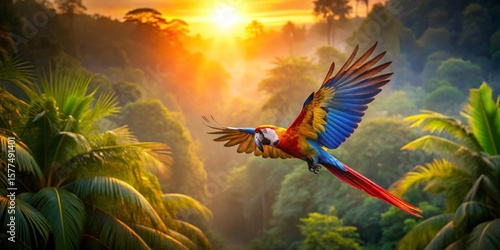 A vibrant scarlet macaw soars gracefully through a lush, tropical paradise at sunset, its brilliant plumage a striking contrast against the golden light and verdant foliage