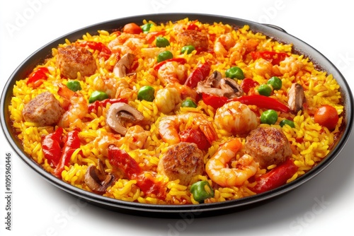 A vibrant seafood paella filled with shrimp, sausage, peppers, and peas, showcasing rich colors and textures.
