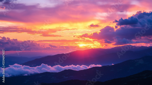 A vibrant sky during sunset, with a mix of deep orange, pink, and purple hues, casting a warm glow over a mountain range with soft clouds in the distance