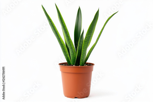 A vibrant snake plant thriving in a simple terracotta pot on a white background. isolated on white background.