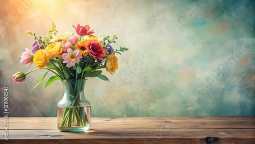 A Vibrant Spring Bouquet in a Glass Vase on a Rustic Wooden Table Against a Soft Textured Background