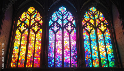 A vibrant stained glass design with intricate patterns and rich colors, resembling classic church or cathedral windows