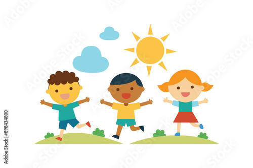 A vibrant summer vector illustration featuring kids enjoying the sunshine. This cheerful design is perfect for children's products, summer-themed projects, and playful outdoor visuals.