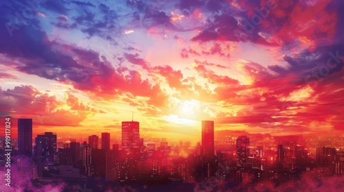 A vibrant sunrise over a city skyline, with buildings outlined against a backdrop of brilliant colors