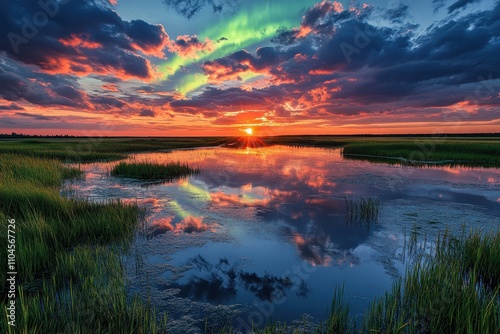 nature, sunset, wetland, colourful, serene, landscape, calmness, sky, water, cloud, grass, dusk, environment, beauty, peaceful, colours, outdoors, scenic, calm, horizon, evening, flora, twilight, natural, atmosphere, picturesque, ecology, panorama, artistic, light, vista, wildlife, warm, bright, contrast, exploration, travel, adventure, serenity, lush, vibrant, growth, wetland