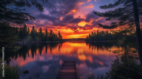 A vibrant sunset over a tranquil lake, framed by pines, invites you to enjoy nature's beauty.