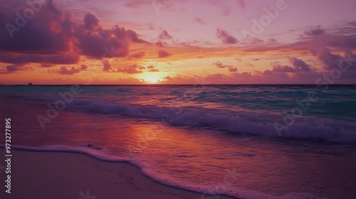 vibrant, sunset, caribbean, coast, gentle, wave, lapping, shore, creating, serene, atmosphere