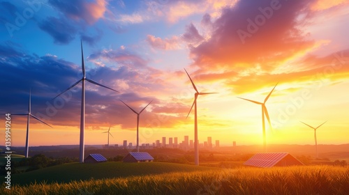A vibrant sunset scene showcasing wind turbines and solar panels in a green landscape, symbolizing renewable energy and sustainability, Sustainable Living.