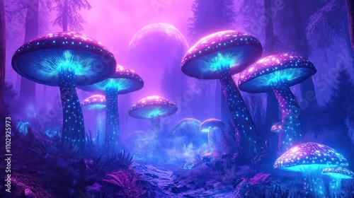 mushroom, glow, forest, fantasy, surreal, purple, blue, nature, aethereal, landscape, light, environment, mystical, flora, fauna, colourful, dreamlike, scene, atmosphere, space, cosmic, high-coloured, enchanting, magical, calmness, wilderness, adventure, exploration, beauty, shadow, depth, ambience, serenity, dusk, twilight, scenery, illumination, plant, habitat, ecosystem, biodiversity, imagination, art, wonder, aesthetic