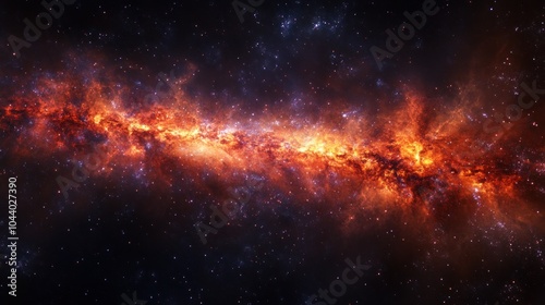 A vibrant, swirling nebula with a central band of orange and red light, surrounded by a field of scattered stars.