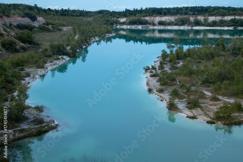 A vibrant teal lake winds through a former quarry, surrounded by green trees and light-colored banks under a soft sky, reflecting the serene environment.