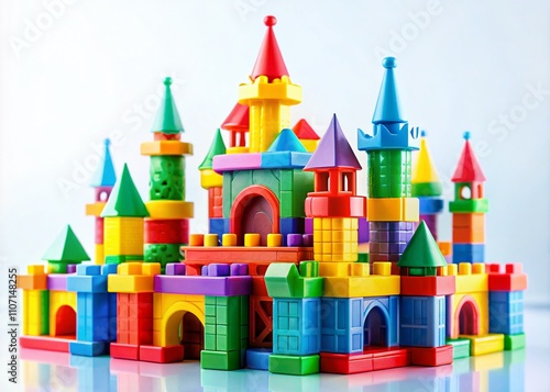 A vibrant toy castle isolated against a white backdrop features colorful block architecture, capturing the essence of children's playtime and educational inspiration through tilt-shift photography.