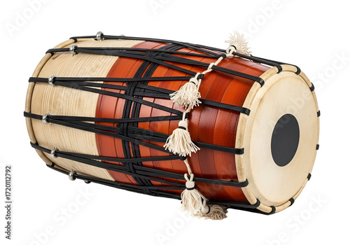 A vibrant, traditional Indian dholak drum, showcasing its intricate design and rich colors against a black backdrop.