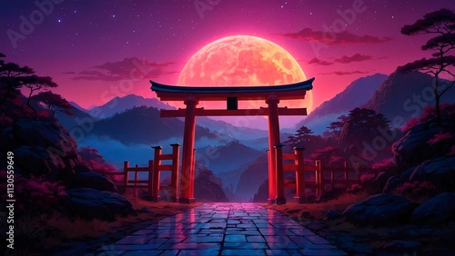 A vibrant traditional Japanese torii gate surrounded by trees and shrubs, and the sky is filled with pink and purple clouds digital art. Colorful neon color palette peacefull and serene illustration.