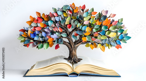 A vibrant tree made from paper leaves rises from an open book, symbolizing knowledge, growth, and creativity in a colorful design.