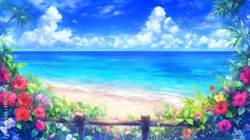 tropical, beach, ocean, flower, blue skies, serene, landscape, illustration, nature, scenery, vacation, summer, tranquil, coastal, view, horizon, cloud, greenery, sand, wave, plant, exotic, vibrant, colourful, peaceful, relaxation, island, bright, sunny, idylli, escape, paradise, scenic, tropical paradise