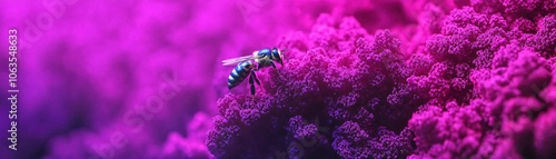 A vibrant underwater scene featuring a bee among colorful coral, showcasing marine life and vivid hues of purple and blue.