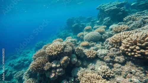 A vibrant underwater scene showcases a diverse array of healthy coral reefs teeming with marine life in a crystal-clear ocean.