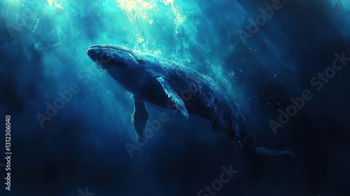 A vibrant underwater tableau featuring a majestic whale at its heart, surrounded by rich blue-green waters, gracefully poised to glide toward the right