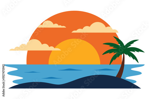 A vibrant vector graphic illustration of a tropical island with a palm tree at sunset