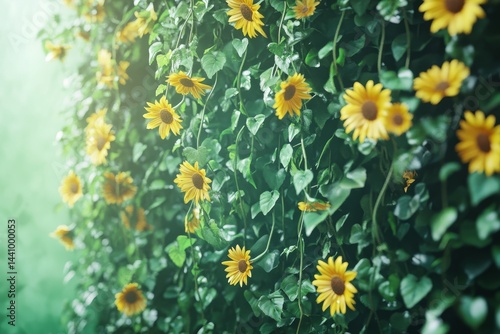 sunflower, flower, plant, wall, foliage, vine, green, yellow, nature, summer, garden, bloom, high-coloured, vibrant, light, leaf, climbing, cascading, texture, pattern, detail, close, up, natural, background, decorative, aesthetic, lush, beautiful, delicate, soft, bright, sunny, closeup, wallpaper, fresh, freshness, spring, blooming, hanging