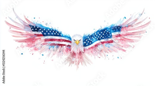 A vibrant watercolor depiction of an eagle with wings spread wide, featuring the colors of the American flag.