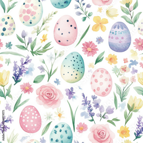 A vibrant watercolor design of Easter eggs and floral patterns arranged in a seamless, flat design on a white background. The Easter eggs are decorated