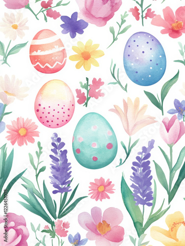 easter, holiday, watercolor, design, seamless, pattern, white background, easter egg, floral, pastel, pink, lavandula, decorative, spring, festive, artistic, elegant, delicate, aesthetic, nature, hand-painted, creative, stylish, digital artwork, background, texture, ornamental, vintage, retro, trendy, seasonal, celebration, happiness, joyful, intricate, detailed, beautiful, modern, illustration, wrapping paper, greeting card, invitation, textile, wallpaper, seamless pattern