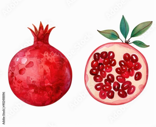 A vibrant watercolor illustration of pomegranates, showcasing their rich color and juicy seeds against a clean white backdrop.