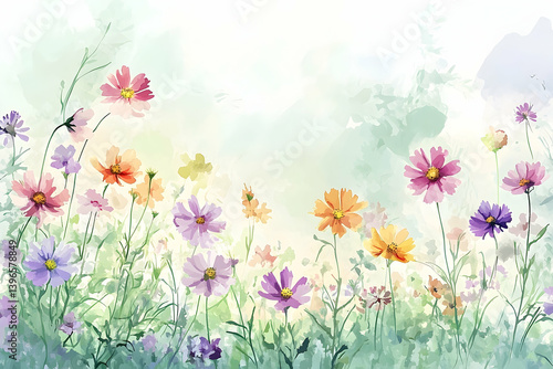 cosmos, flower, field, colourful, vibrant, watercolor, painting, nature, spring, summer, garden, flora, botanical, illustration, art, design, aesthetic, beautiful, delicate, pastel, colours, pretty, high-coloured, bright, lush, meadow, blooming, peaceful, springtime, summer, plant, green, leaf, stem, flower petals, yellow, orange, pink, purple, soft, light, subtile, background, pattern, decor