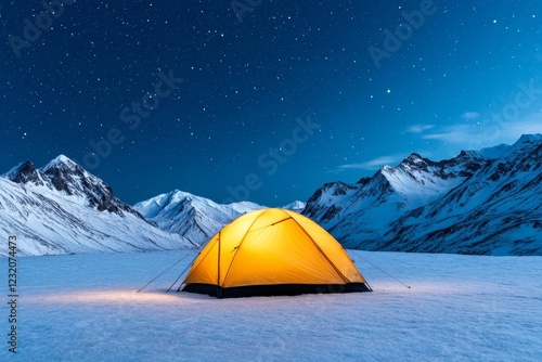A vibrant yellow tent brightly stands out against a beautiful snowy mountain backdrop during the tranquil dusk