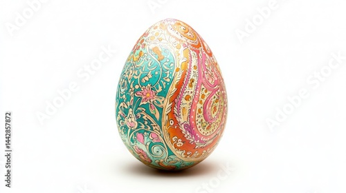 A vibrantly decorated Easter egg featuring intricate, colorful paisley patterns in shades of pink, blue, green, and orange, a brightly colored and intricately patterned Easter egg,
