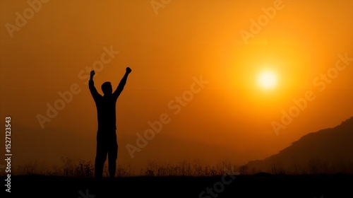 A victorious silhouette raising arms in triumph against a blazing sunset celebrating achievement and hard work with