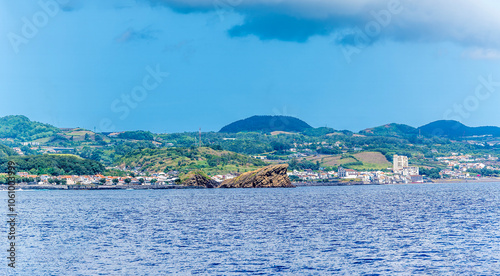 A view from a boat along the coast around the Dog Face Islet on the island of San Miguel in the Azores in summertime