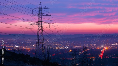 view, city, night, power, line, light, sunset, dusk, electricity, fuel, generation, outdoors, line, pylon, silhouette, supply, nature, mountain, industry, structure, back, lit, architecture, construction, blue, technology, equipment, generator, steel, sun, sunrise, dawn, landscape, cloud, sky, urban, skyline, building, activity, environment, metal, danger, grid, pole, factory, city landscape, engineering, twilight