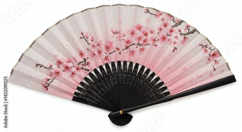 A view of a hand fan with pink cherry blossoms on a white background in a studio setting