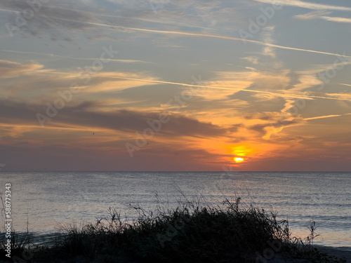 A view of a Sunset on the beach at Siesta Key, Florida with a blue cloudy sky.