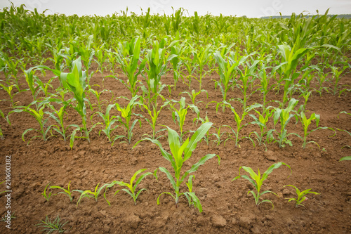 A view of a young corn plants on the field.
