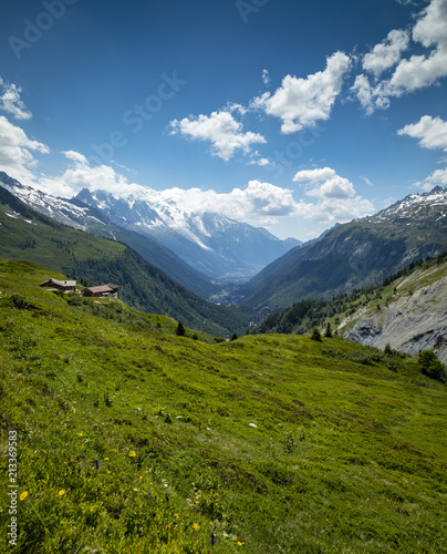 a view of the chamonix valley from the alpine mountains in the Vallorcine area with foreground of alpine meadows on a clear summer day with blue sky and bright clouds