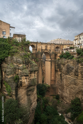 A view of the spectacular gorge and historic bridge, seperating and joining the two parts of Ronda, a famous village in Adalusia, Spain