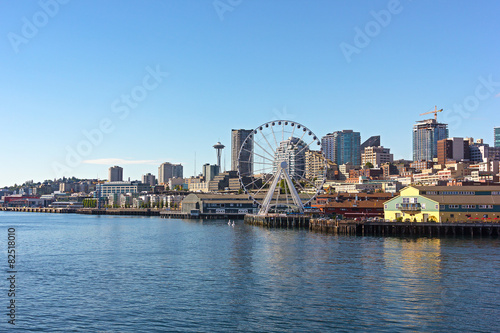 city, downtown, america, us, view, pier, northwest, waterfront, urban, landmark, sun, skyline, washington, building, dock, architecture, colours, colourful, blue, sky, bay, tour tourism, skyscraper, sea, beautiful, water, puget sound, seattle, ocean, harbor, city landscape, scenic, panorama, ferris, wheel